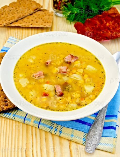 Гороховый суп с хлебцами в тарелке
