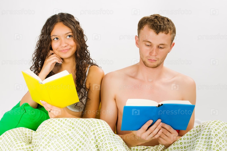 Молодожены отдыхают в спальне с книгами