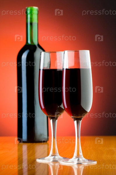 Красное вино и бокалы на красном фоне