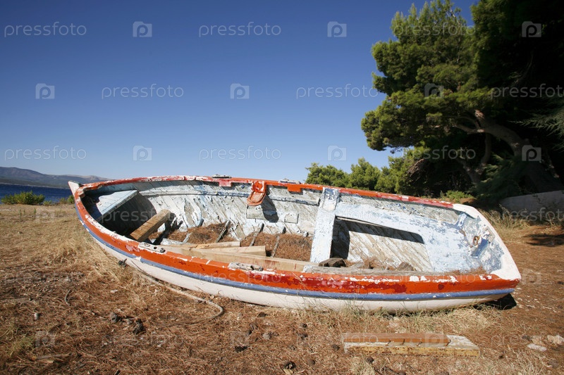 Старая рыбацкая лодка, брошенная на пляже, Хорватия