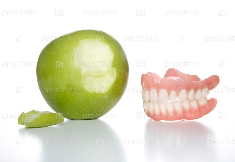 Откушенное яблоко и макет челюсти