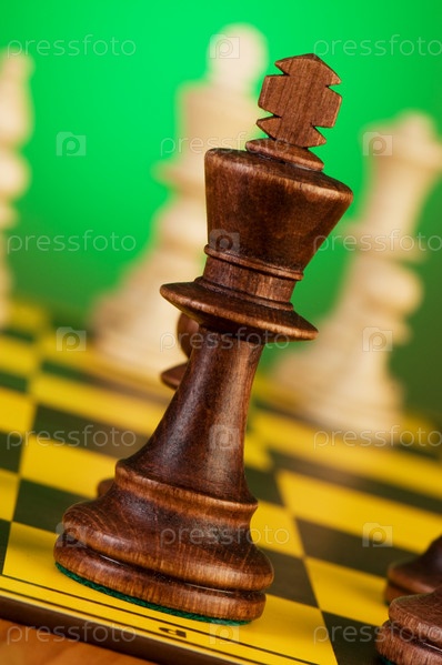 Шахматные фигуры на доске, на зеленом фоне