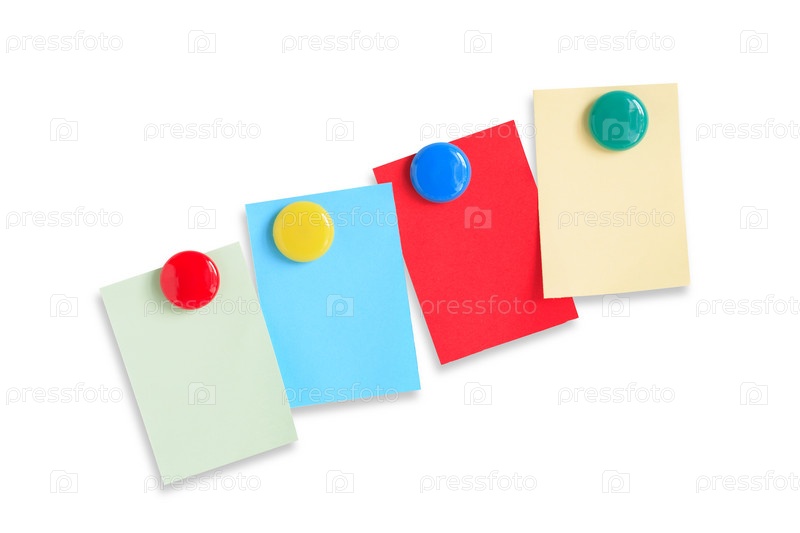 Цветные листы бумаги висят на магнитах на белом фоне