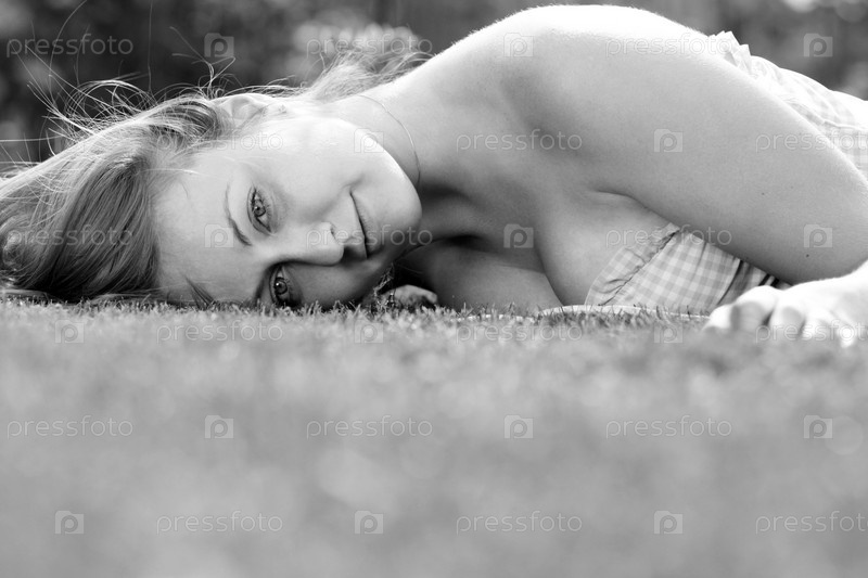 Молодая женщина лежит на траве в парке