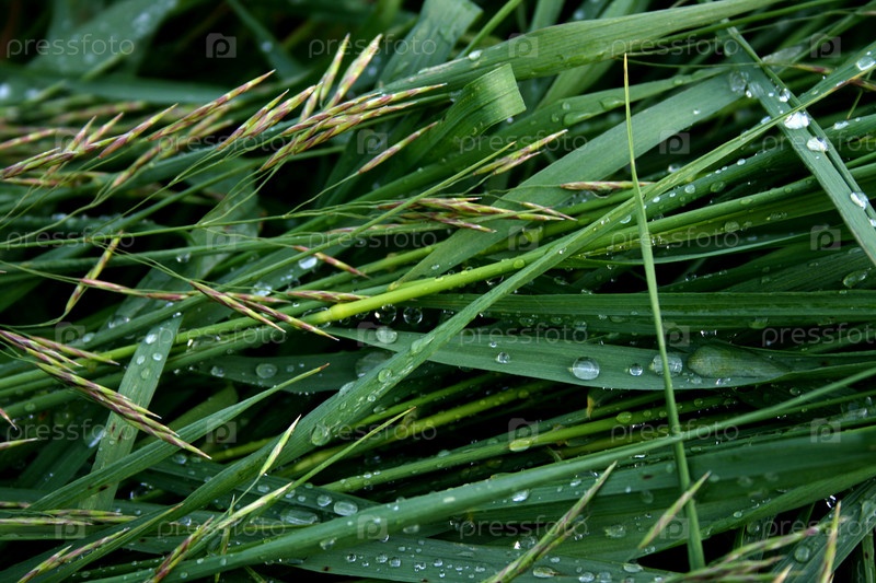 Капли росы на зеленой траве крупным планом