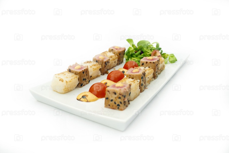 Тарелка суши, украшенная салатом и овощами