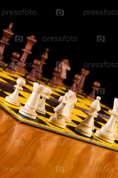 Шахматные фигуры на доске, на черном фоне