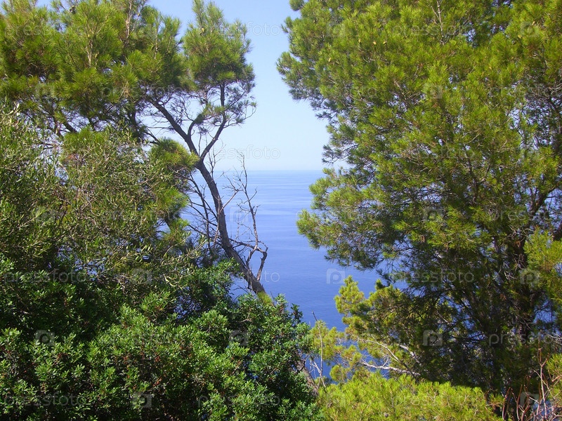 Вид на Средиземное море через деревья, Мальорка, Испания