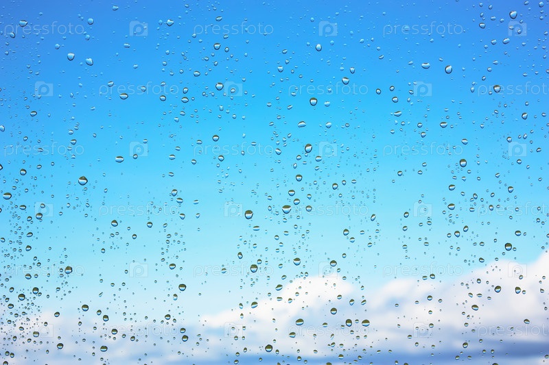 Капли воды на стекле на фоне голубого неба с облаками