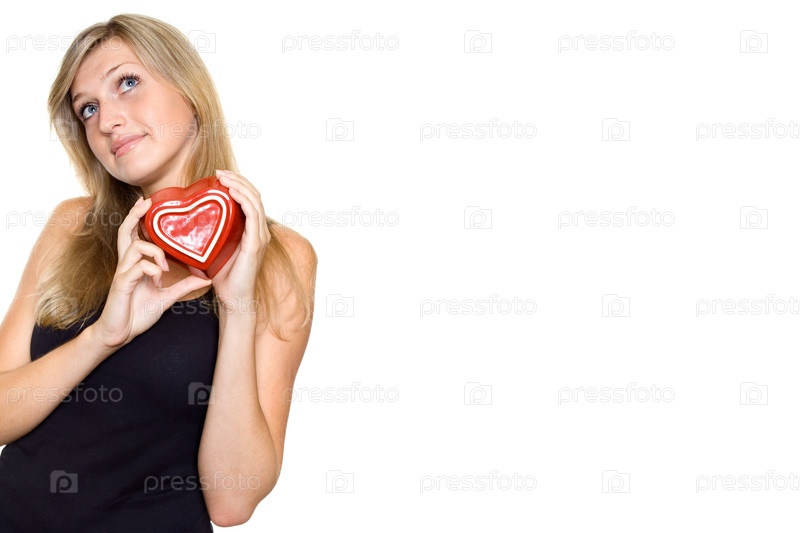 Портрет красивой блондинки с сердцем в руках на белом фоне