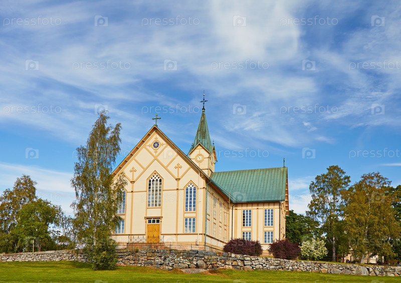 Финская деревянная сельская католическая церковь в солнечный летний день