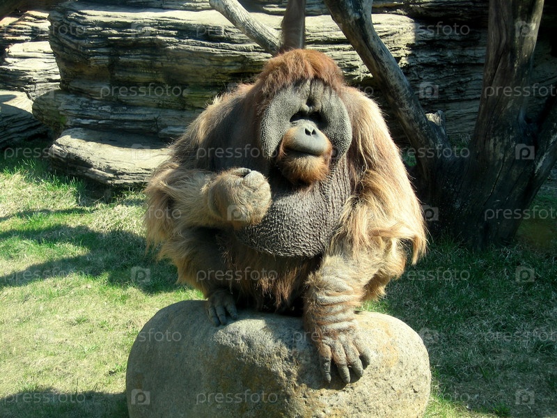 Орангутанг сидит на камне и показывает кулак