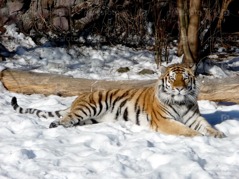Тигр лежит на снегу в зоопарке