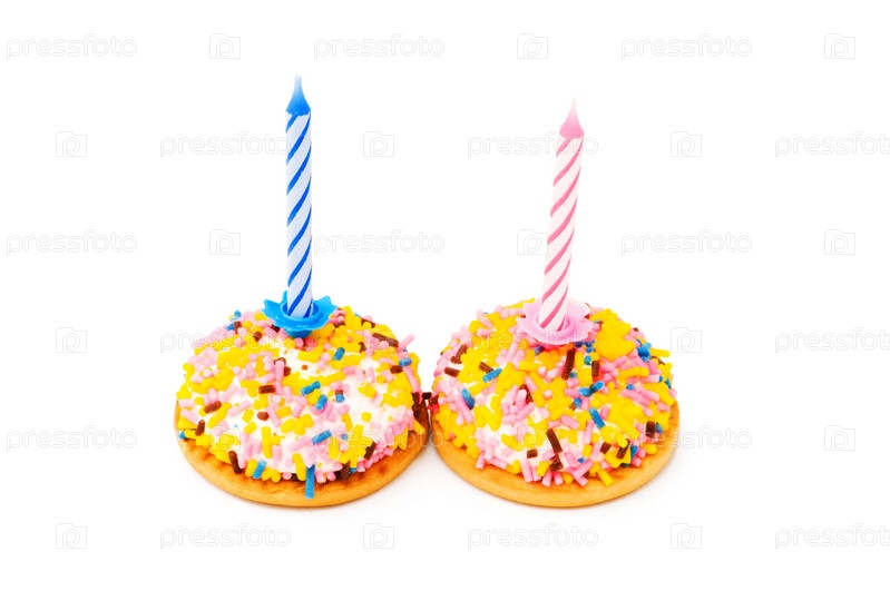 Два пирожных со свечами на белом фоне
