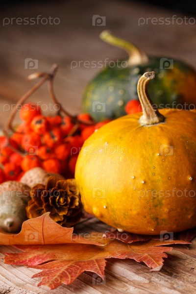 Собранные тыквы с осенними листьями