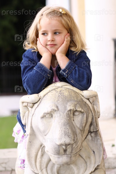 Маленькая девочка рядом со скульптурой льва