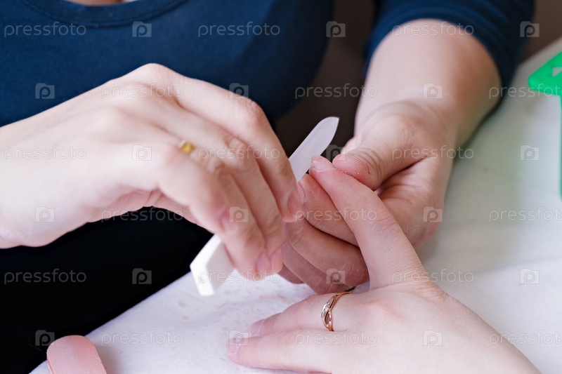 Мастер маникюра отрабатывает женские ногти, крупный план