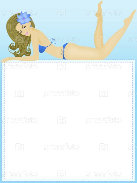 Девушка в синем купальнике над белой рамкой для текста