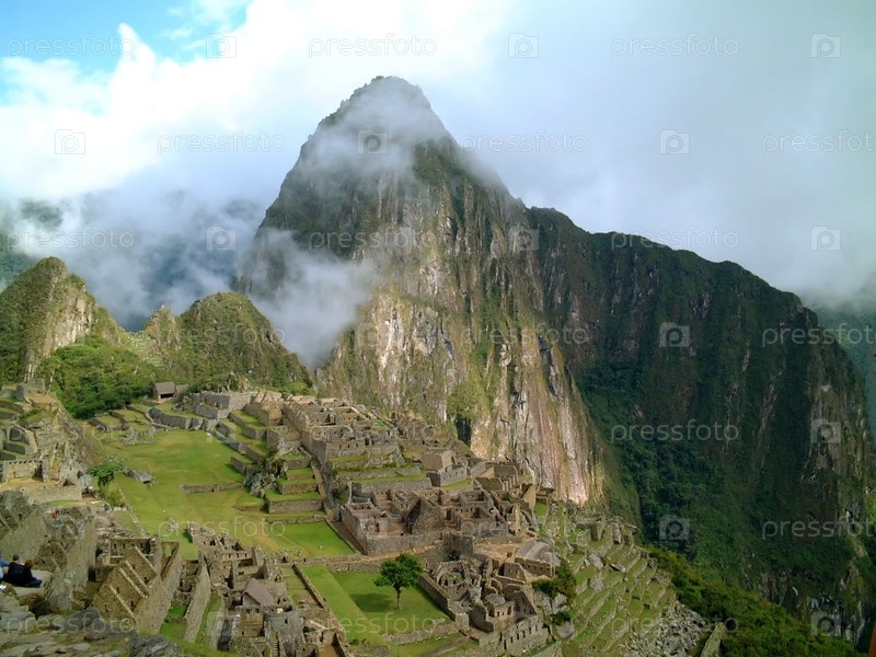 Легкое облако пересекает Мачу-Пикчу в солнечный день, Перу