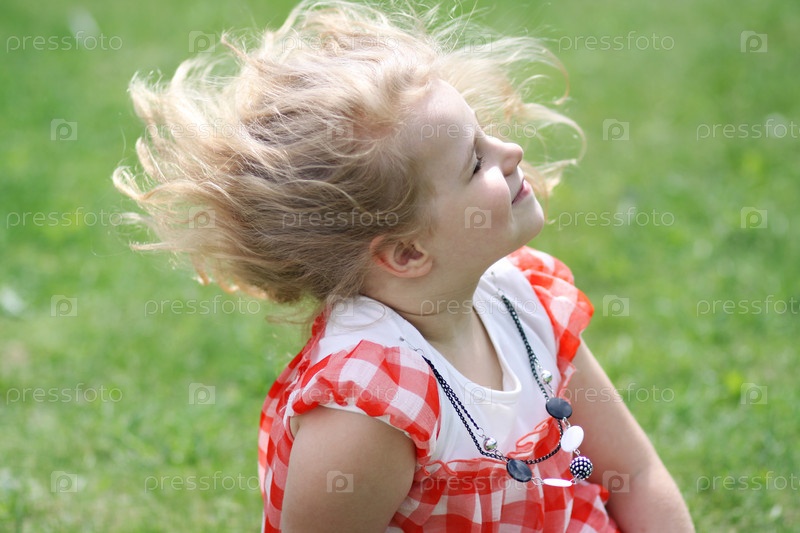 Маленькая девочка в клетчатом платье встряхивает волосами