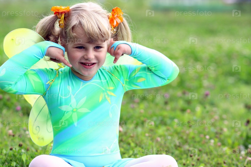 Маленькая девочка в костюме бабочки сидит на траве