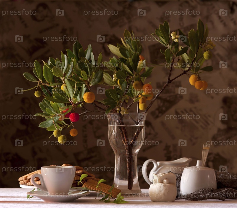 Натурморт с веточкой клубники, арбутом и белой посудой