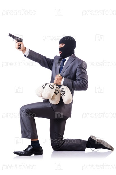 Бандит с мешками денег на белом фоне