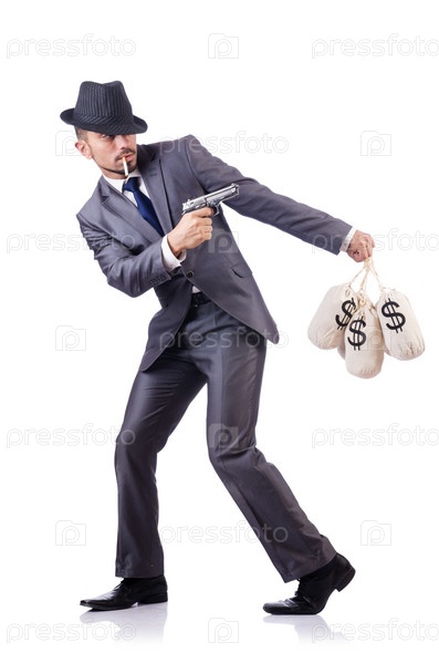 Человек с мешками денег на белом фоне