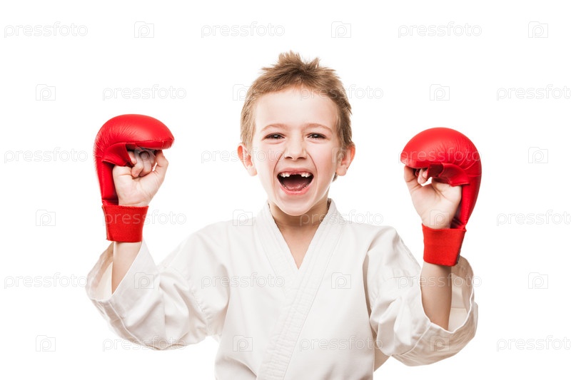 Улыбающийся маленький каратист празднует победу