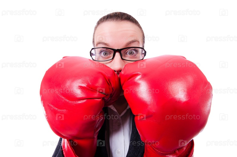 Женщина в боксерских перчатках на белом фоне
