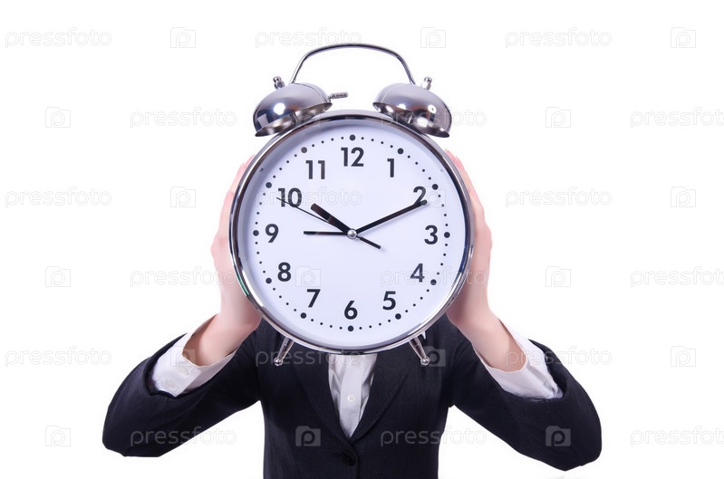 Смешная женщина с часами на белом фоне