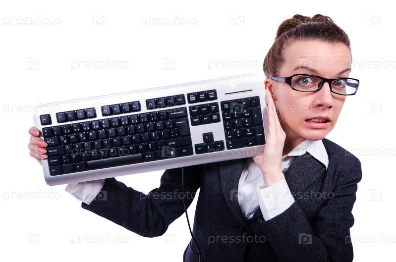 Бизнес-леди в очках с клавиатурой на белом фоне