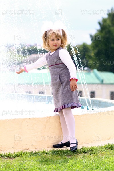 Маленькая девочка играет у фонтана