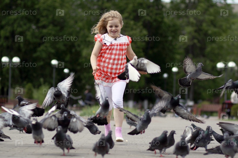 Маленькая девочка гоняет голубей