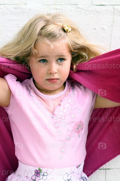 Маленькая девочка в розовой шали на фоне белой стены