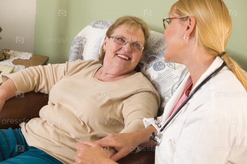 Врач или медсестра разговариваривает с сидящей пожилой женщиной