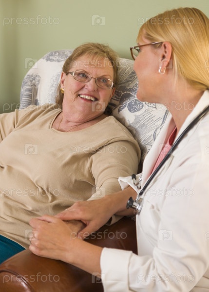Врач или медсестра разговариваривает с сидящей пожилой женщиной