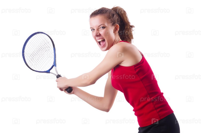 Женщина играет в теннис на белом фоне