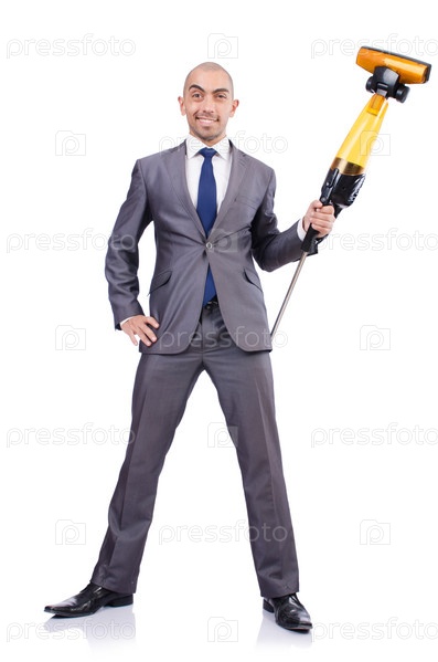 Бизнесмен с пылесосом на белом фоне