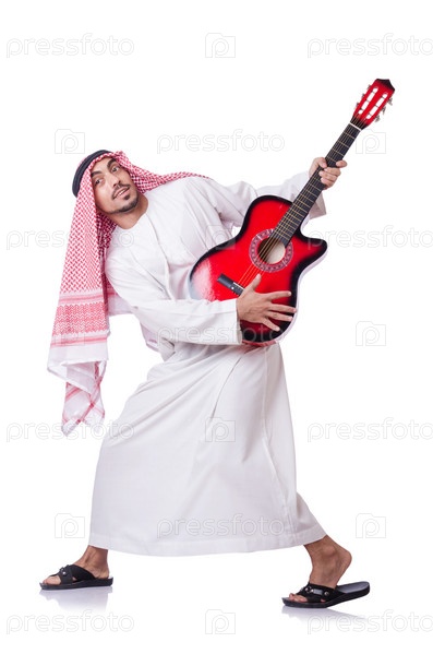 Араб играет на гитаре, изолированный на белом фоне