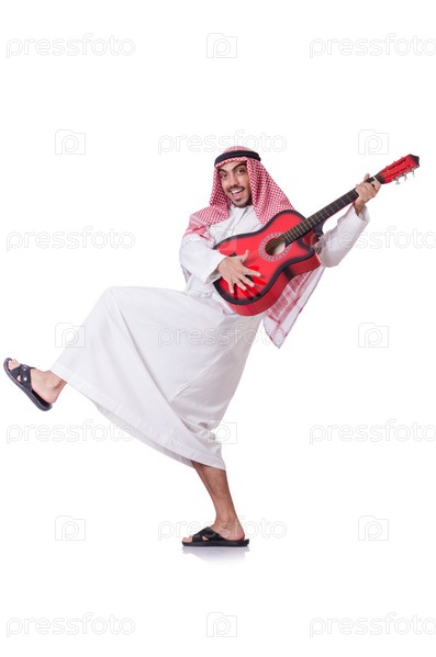 Араб играет на гитаре, изолированный на белом фоне