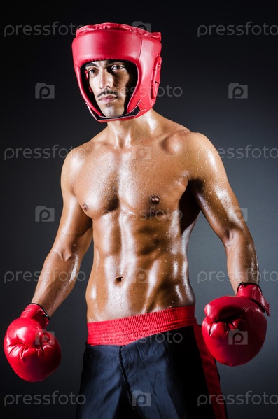 Боксер в красных перчаткахи в темной комнате