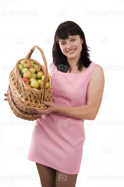 Женщина в розовом платье с полной корзиной яблок