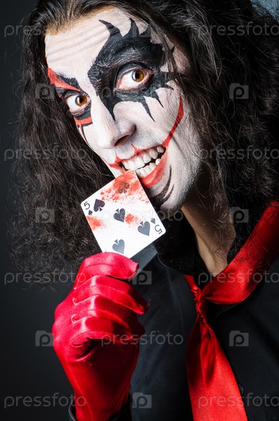 Злой клоун с картами в темной комнате