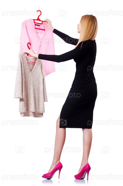 Молодая женщина примеряет новую одежду на белом фоне