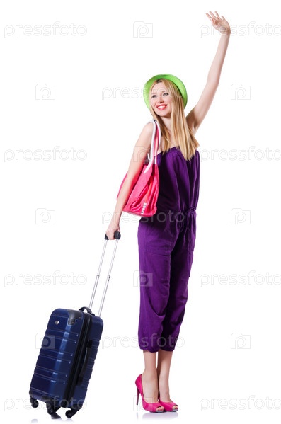 Молодая женщина с чемоданом на белом фоне