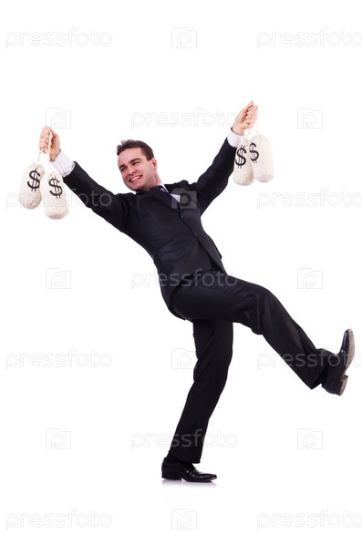 Человек с мешками деньги на белом фоне