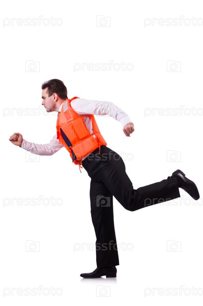 Бизнесмен в спасательном жилете на белом фоне
