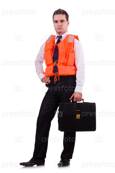 Бизнесмен в спасательном жилете на белом фоне