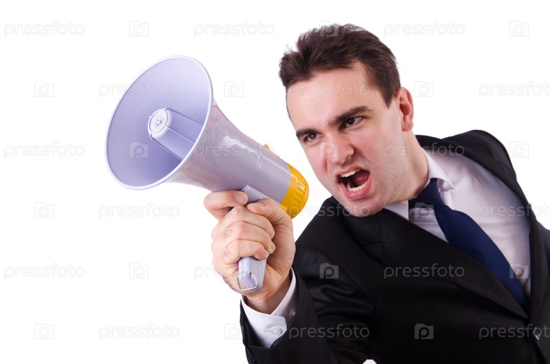 Молодой предприниматель с громкоговорителем на белом фоне